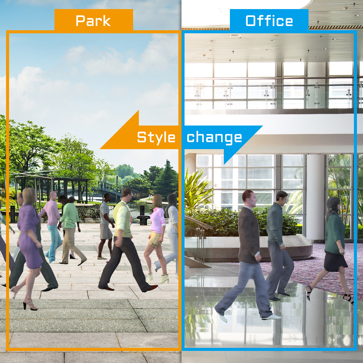 そこで当社は、CG技術で仮想空間に任意の環境・人・物を構築し、そこから得られる情報を元にアノテーション作業を自動化、コストのかかっていた教師データを効率的に作成するツールを開発しました。ツールに取り込む3Dデータや背景・動きはユーザーが任意に設定が可能な為、例えば仮想的に作り出したランダムな人の行動パターンや、様々な姿勢の教師データを、簡単かつ大量に作成することを可能にしています。