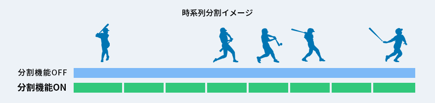 この状態を軽減するため、時系列を維持したまま分割し入力フレーム数の調整を行い、動きを学習する際に連続した各動作の判別をしやすくすることで、学習時の不安定性を軽減することが可能になりました。