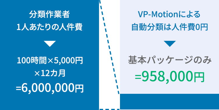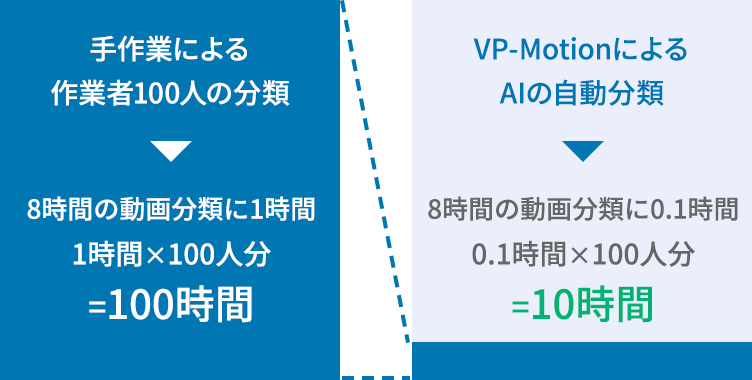 VP-Motionを実際に導入した効果の例として、作業者100人の作業が録画された動画データから作業内容の分類を行う際に、手作業の場合とVP-Motionを活用した場合の、作業時間やコストを比較すると以下のような削減効果が見込めます。