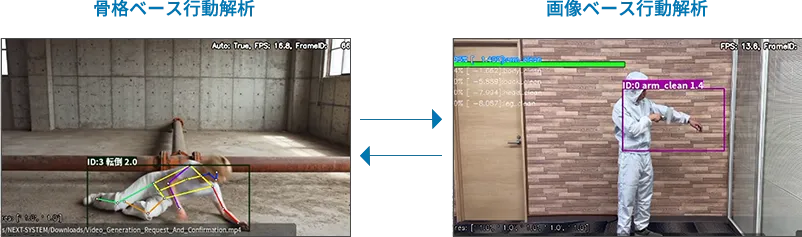 Step2で作成した学習済モデルを使って、認識したい行動を検出できる監視システムで、行動検出ログ付きの監視カメラの録画ソフトとしてもお使いいただけます。またリアルタイム映像と動画を使用できます。検出パターンとして骨格ベースと画像ベースの2つのアプローチで、行動を認識することを可能にしています。
