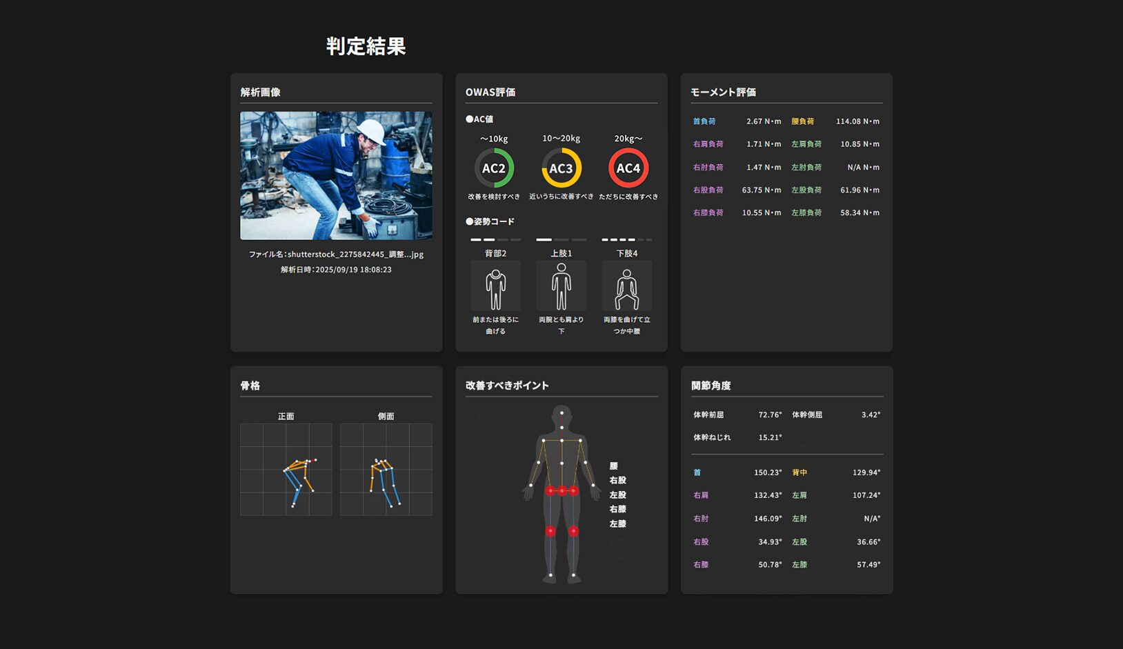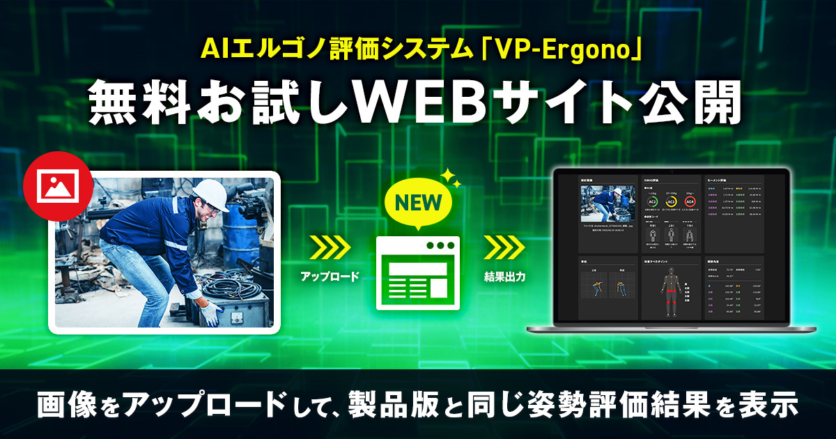 株式会社ネクストシステム(本社:福岡県福岡市、代表取締役:木村晋宏)は、人物の骨格情報から身体に掛かる負荷を解析・評価するAIエルゴノ評価システム「VP-Ergono」の評価結果をお試しできるWEBサイトを2025年9月26日より公開しました。