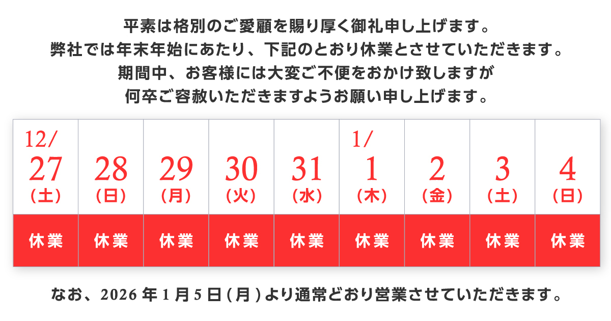 休業期間:2025年12月27日(土)〜2025年1月4日(日)