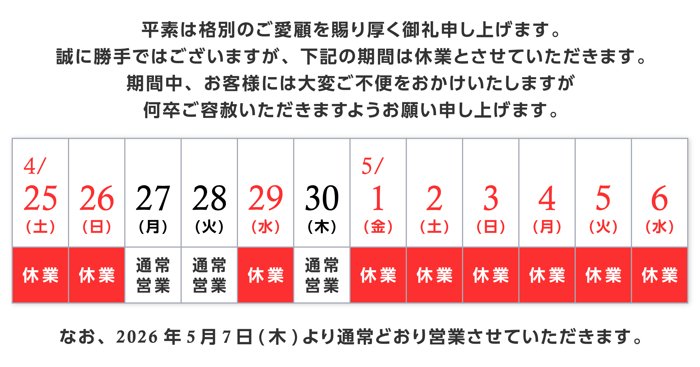 お知らせ ホーム新着情報お知らせゴールデンウィーク休業期間のお知らせ 2026.04.14 お知らせ ゴールデンウィーク休業期間のお知らせ 休業期間中にいただいた「お問い合わせ」につきましては、通常営業日の対応とさせていただきます。 大変ご不便とご迷惑をおかけ致しますが、何卒ご了承くださいますようお願い申し上げます。 前の記事 次の記事 お気軽にご相談ください お問い合わせ